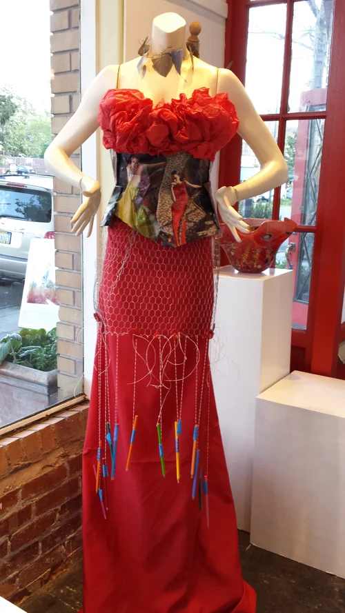 I partnered with Deb Shattil, fellow artist, to create this installation for a Berkeley student cello concert at ACCI Gallery. We created the entire dress (on a vintage I. Magnin mannequin) and cello cutout using: magazine pages, fabric, colored pencils, tissue paper, chicken wire and cardboard.