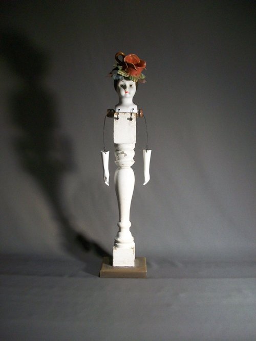 Found wooden boxes, recycled doll head, chair spindles, found finial.